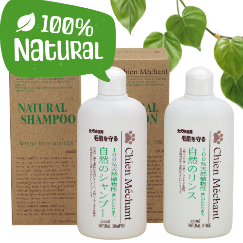 「天然成分配合」や「植物性成分配合」など曖昧な表現の製品が多いですが、「自然のシャンプー」は正真正銘の100%天然原料のみで作られています。合成界面活性剤や人工着色料、防腐剤、合成保存料などを一切使用していないので、肌の弱い犬にも安心して使えます。過って飲んでも大丈夫。泡立ちがとてもよく、泡切れもよいのが特徴です。万一すすぎ不足でシャンプー成分が残留しても炎症は起きないので、アレルギーのわんちゃんにも安心して使用できます。また、湿疹などの心配もなく、臭いも出にくくなります。さらに静電気が起きにくいので、汚れにくくなり、毛の艶が目に見えて良くなります。