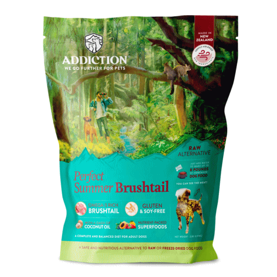 ニュージーランドに生息する野生のブラッシュテイル肉を使用したグレインフリーフード。ブラッシュテイルは自然のベリーや樹木の葉しか食べない為、抗生物質やホルモン剤が一切含まれていない肉であり、オメガ3 脂肪酸・オメガ6 脂肪酸が豊富に含まれています。食物アレルギー対策としても有用なブラッシュテイル肉を45%以上使用し、新鮮なパパイヤやホウレンソウとともに、共役リノール酸・葉酸やミネラル類、繊維質が豊富なサンフラワーシードも使用しています。