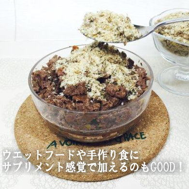 その他には、現在ご利用中のドライフードにトッピング。ドライフードでは補えない酵素等が摂取出来ます。その際は水は加えても加えなくても構いません。水を飲む量が少ない子には水を加えてトッピングする事をおすすめします。また、本製品の食いつきが非常に良いので、トッピングする事でドライフードの飽きを軽減させる事が出来ます。