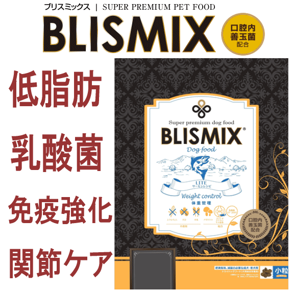 ブリスミックス LITE ウェイトコントロールは、サーモンを主原材とした小粒タイプのドッグフードです。冷凍のお肉や野菜を使用しておりませんので、食材本来の風味・旨味を保持し、大変高い嗜好性を保っています。また、アレルギーの原因になりやすい肉副産物・人工保存料・着色料は使用していません。更に、犬が消化を苦手とするでんぷん質の多い、小麦・大豆・とうもろこしも不使用。愛犬に安心して与えていただける素材を人間の食品基準で厳選しています。 そして、お口の状態を整えてくれる口腔内善玉菌K12を配合!お歯磨きの苦手な子におすすめのプレミアムドッグフードです。体重管理の必要な成犬や高齢期のシニア犬におすすめです。