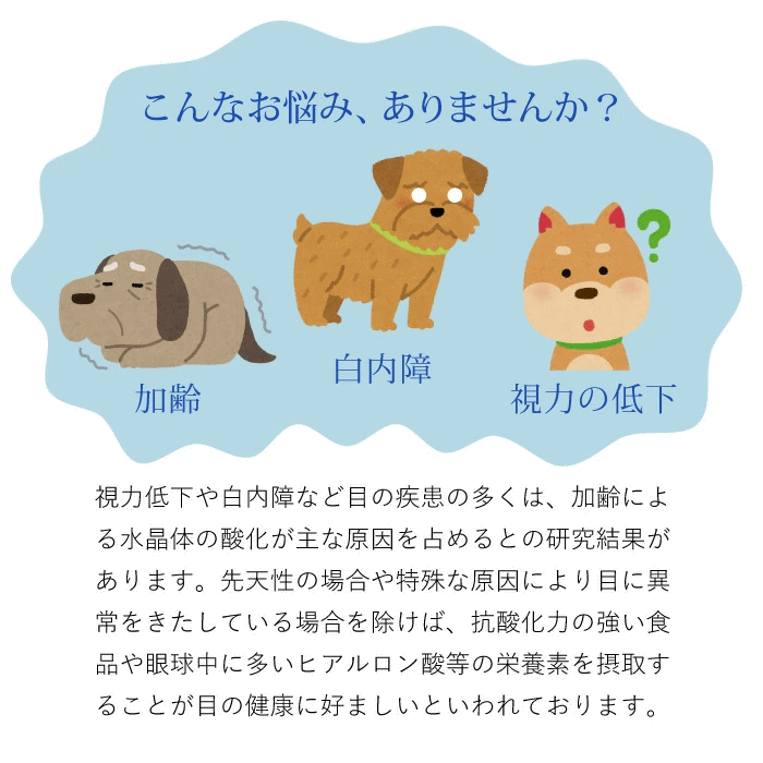 アイケアブライトは目の病気、または目に疾患などを抱えた動物の体質を改善することを目的として開発された製品です。視力の低下や白内障など、目の疾患の多くは加齢によって目の水晶体が徐々に酸化することが主な原因を占めているとの研究がされています。