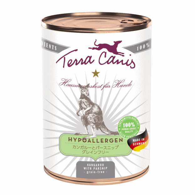 Dr.Martin(ドイツの小動物の皮膚科医)の研究に基づき食物アレルギーや不耐性に悩まされている愛犬の為に開発されたウエットフードです。希少な単一タンパクであるカンガルーの筋肉部分を使用することにより、特定したアレルギーを持つ愛犬に適しています。もちろんアレルギーの無い子にもご利用いただけます。尚、テラカニスの缶詰は内側に防サビ加工が施されておりますので、開封後も缶詰のままで保存が可能です。ラップなどで蓋をして冷蔵庫で保存ください。開封後の使用期限の目安は約3日です。また、冷凍の場合は約3週間の保存が可能です。