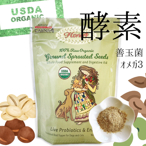 FLORA4 ローフードトッパー スプラウトシードには生きたプロバイオティクス(善玉菌)が「製品1kgあたり170億cfu」、酵素が「製品1kgあたり100万U」、更に21種類の必須ビタミンとミネラル、高レベルのオメガ3脂肪酸及びオメガ6脂肪酸が含まれ、化学合成物質を全く使用しない有機発芽種子で作られています。愛犬・愛猫の体の隅々の事を本当に考え作られた安心で安全なサプリメントです。下痢や軟便、便秘、空腹時の胃液抑制、涙やけなどのお悩みの解消にお役立てください。年齢問わずご利用いただけますので、離乳期から高齢期まで幅広くご利用ください。